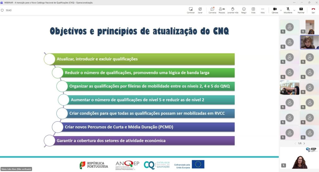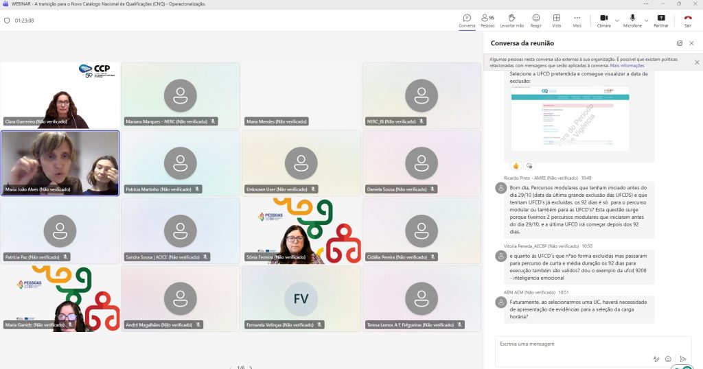 A sessão online teve a presença de 94 participantes e contou com uma intervenção técnica dedicada à “Transição para o Novo Catálogo Nacional de Qualificações (CNQ): operacionalização e implicações no financiamento – ANQEP / PESSOAS 2030”, seguindo-se um espaço de perguntas e respostas.