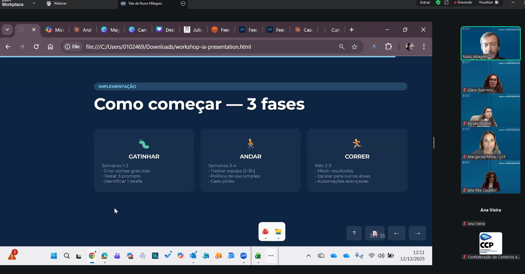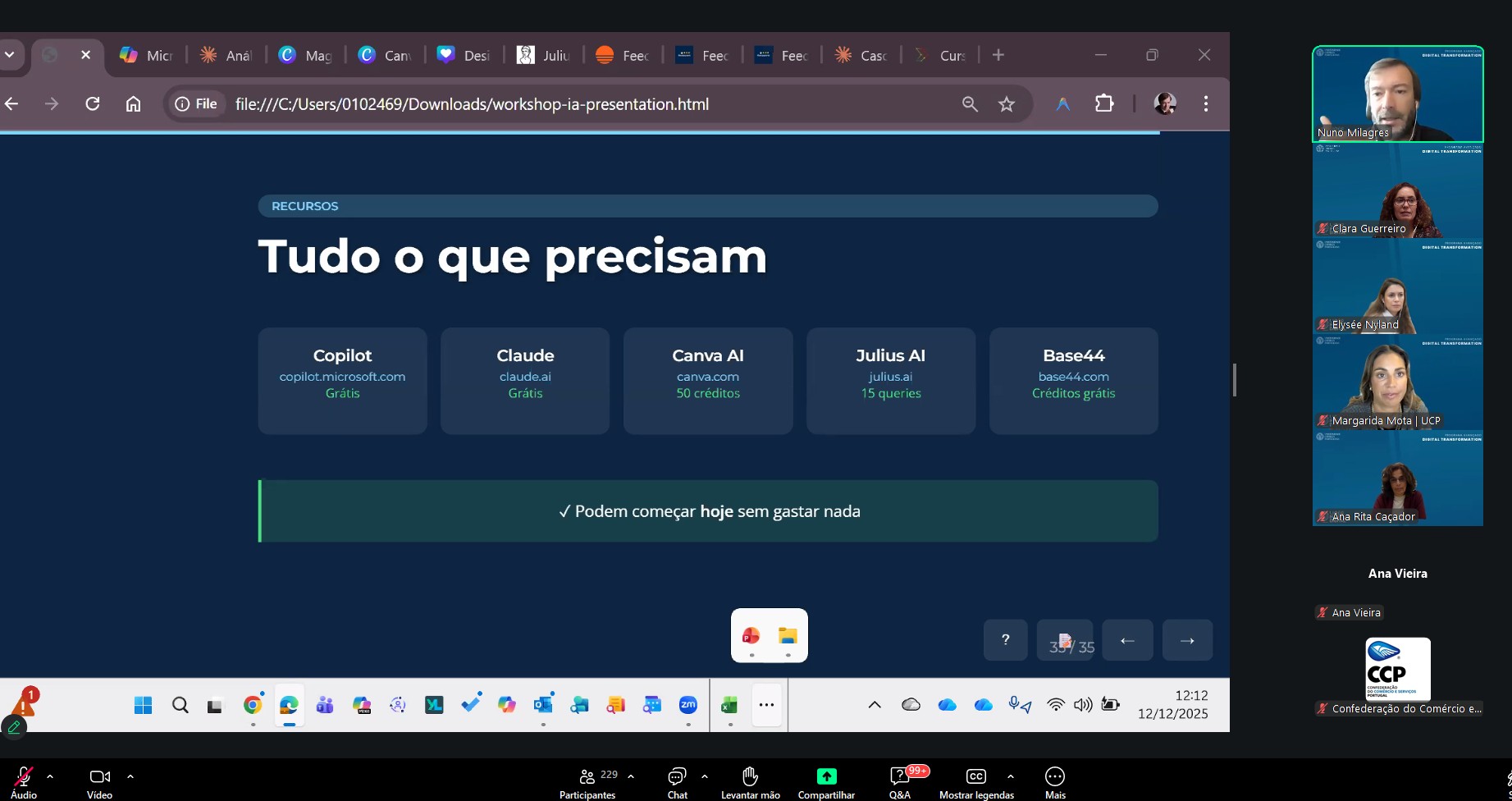 Ao longo da sessão, foram demonstradas aplicações práticas de IA em áreas como marketing, atendimento ao cliente, análise de dados e criação de conteúdos, recorrendo a ferramentas acessíveis e com versões gratuitas, adaptadas à realidade das PME.